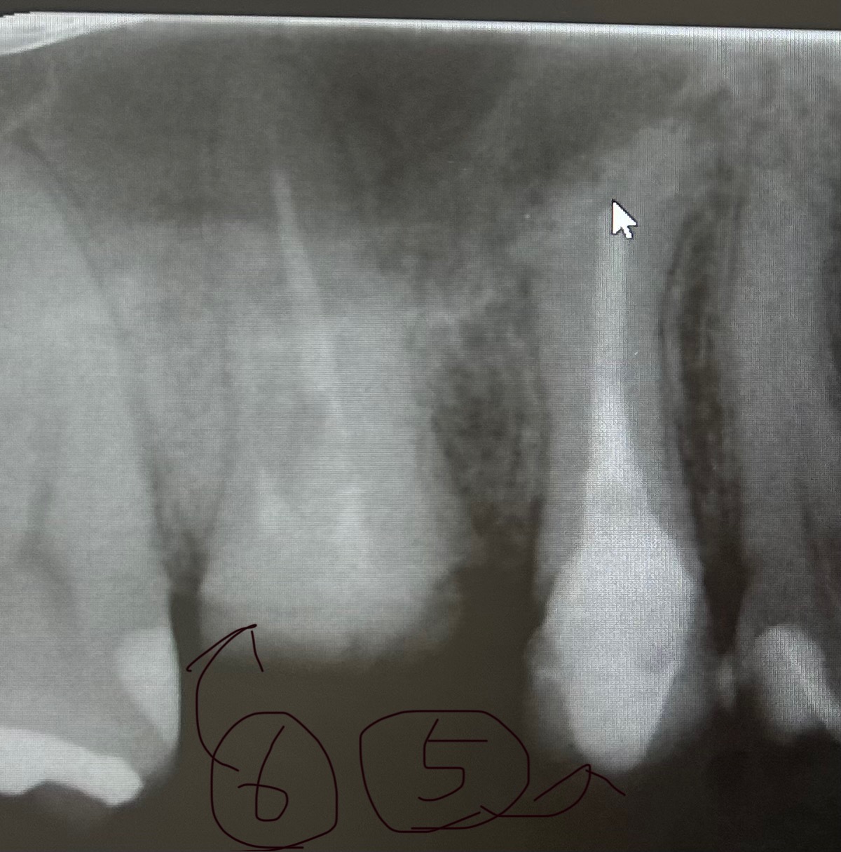 しかし、なんとなく、治療がはじまってから、5番の方が疼いている感じがして、気になってます。大学病院の、歯科に紹介されて小さいレントゲンにて、5番は下までちゃんと薬も入ってるし大丈夫でしょう。と言われましたが、歯の先がモヤモヤしているところがあり、気になります。6番も、固くて奥までなかなか進めないらしく、難航しています。