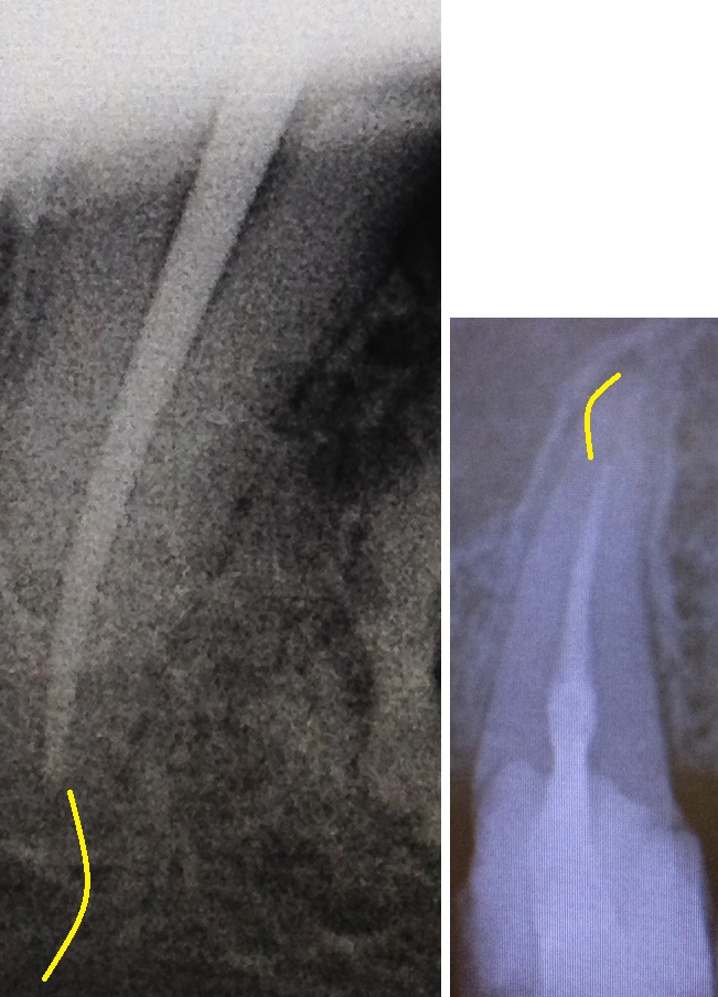 1)保険のRCFガッタパーチャの方式で、根尖付近にサラサラした薬を置いてから、天然ゴムのガッタパーチャを流す方法と、薬を置かずガッタパーチャだけを流す方法と2パターンあるのですか?過去にした時は、薬を置くパターンで、今回は置かないパターンでした。(写真1枚目黄線部分)