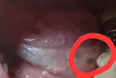 先週の日曜日に口の中が痛いなと思い鏡でよくみたら舌の裏に口内炎ができまして、もう一つ痛みのない黒色まではいなかい紫色っぽい楕円形のできもの?みたいなのがありました。