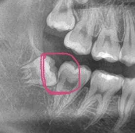 また親知らずがこのように生えていると虫歯になりやすいので第2大臼歯を残したければ親知らずは抜かれた方が無難です。