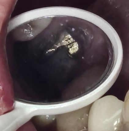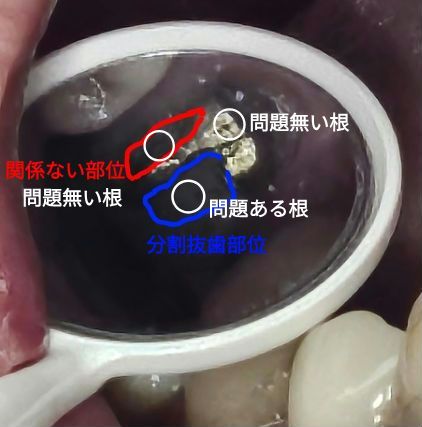根幹3本中1本の歯根破折、フィステルにより、痛みやぐらつきはありませんが、先日、右上6番の分割抜歯を行いました。