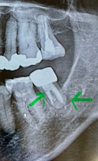 歯の根の下に黒っぽい場所(黄緑でマーキング親知らず側)があってそこから歯茎の方に膿が出ている。