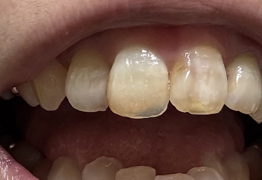その直後に気づいたのですが、前歯2本のうち1本の先端が透けていて、遠目で見るとグレーに見えてしまいます。